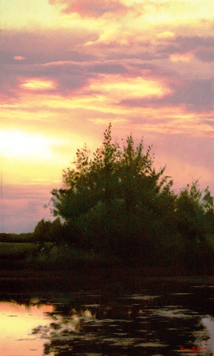 oil on canvas 40 x 24 inches Bruce Brainard is an outdoorsman and former professional skier who has made a study of atmospheric light in all of its myriad combinations. This could be a scene near a favorite spot on the Madison River near Bozeman, Montana. |
